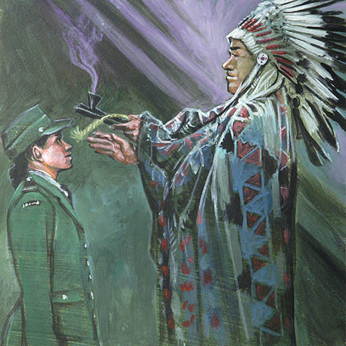 The painting shows Mary Greyeyes Reid being blessed by a native elder. Mary Reid was a Cree women who was the first Indigenous women to serve in the Canadian Women's Army Corp during the Second World War.