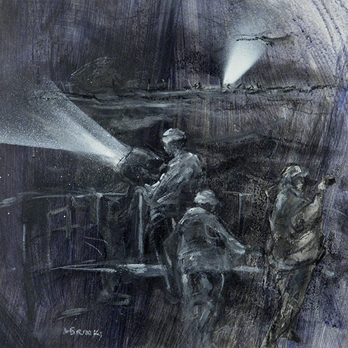 Frank comments, "I served with the Navy and used to go up on deck at night and sketch the patrollers. I then developed the painting in my London studio after each stint on a ship. I went on every ship I could find; corvettes, aircraft carriers, submarines: it was a wonderful experience. I was very honoured to be a war artist".